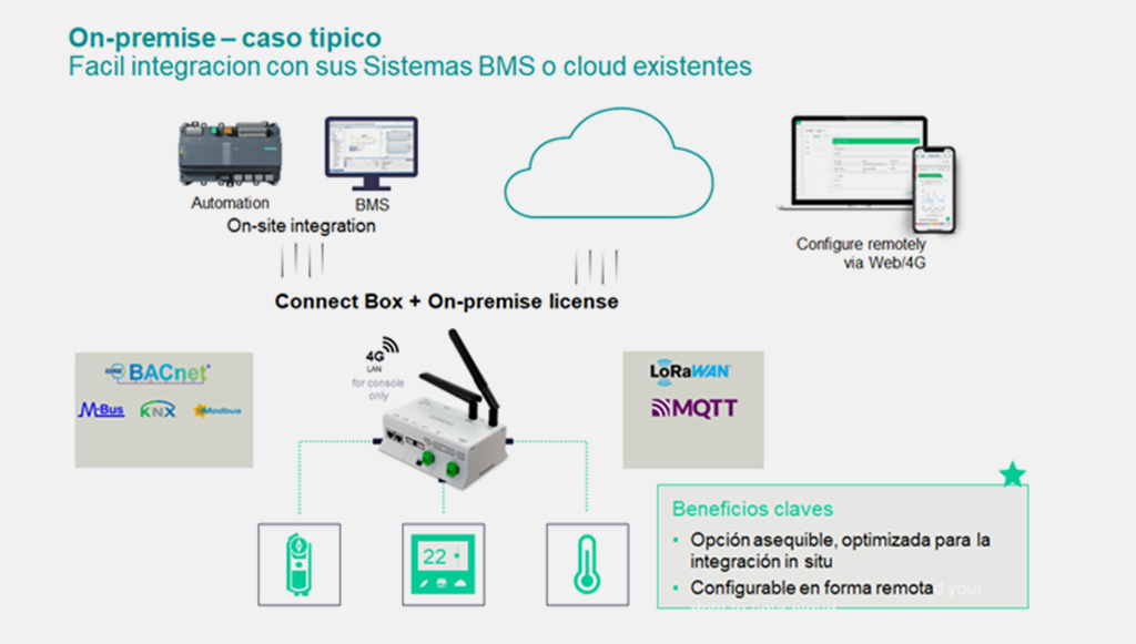 Se conecta a una amplia gama de equipos en un edificio: Sensores y medidores; equipos de calefacción, refrigeración y tratamiento de aire; sistemas de automatización y control de edificios (BACS) basados en un catálogo de dispositivos y equipos independiente del fabricante. (Ver listado de dispositivos compatibles).