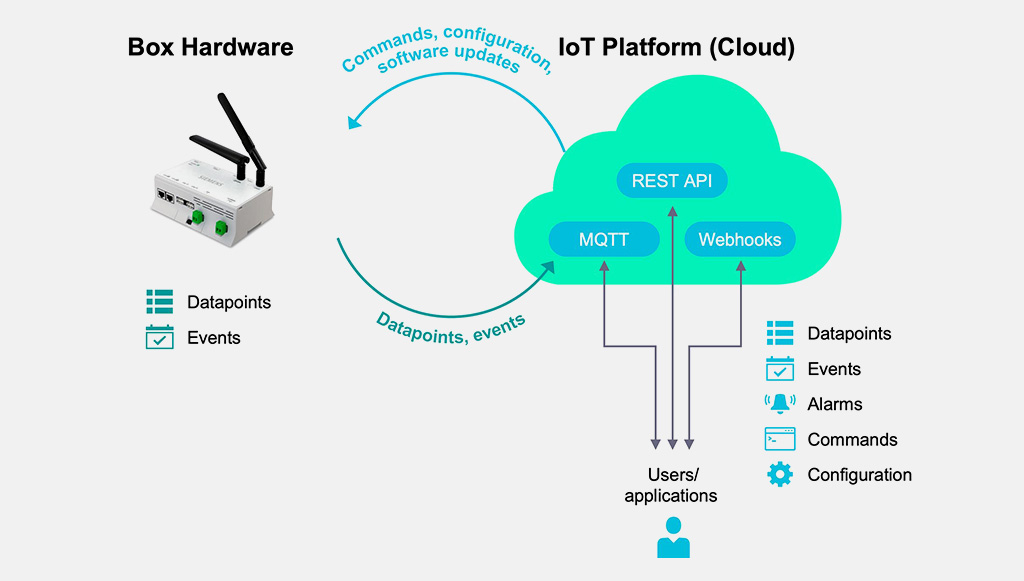 La entrega consiste en el hardware Connect Box y una licencia de software para desbloquear la funcionalidad individual en la plataforma IoT, así como las interfaces web de usuario y legibles por máquina.